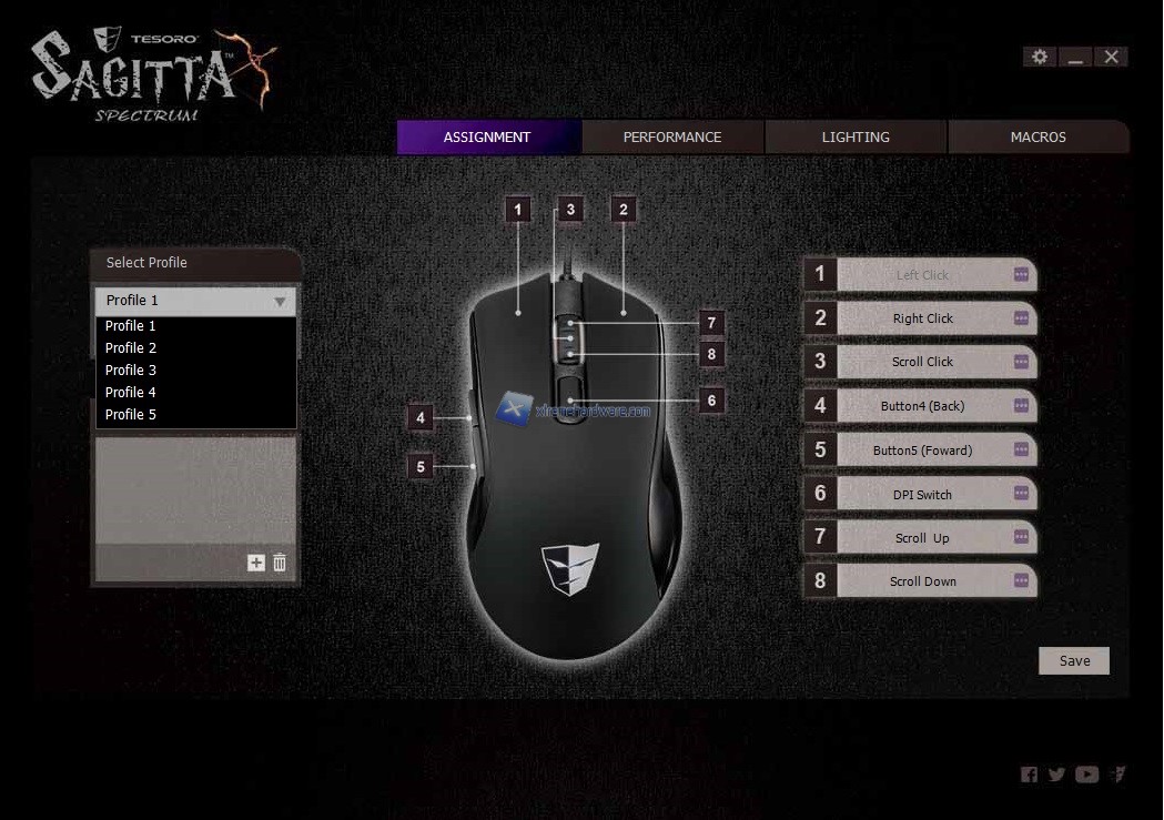 Come sempre anche nel bundle del Tesoro Sagitta Spectrum non viene fornito alcun software di gestione che ci permetterà di agire sui maggiori parametri ed impostazioni del mouse, dunque dovremo provvedere a collegarci al sito di Tesoro e scaricarlo.