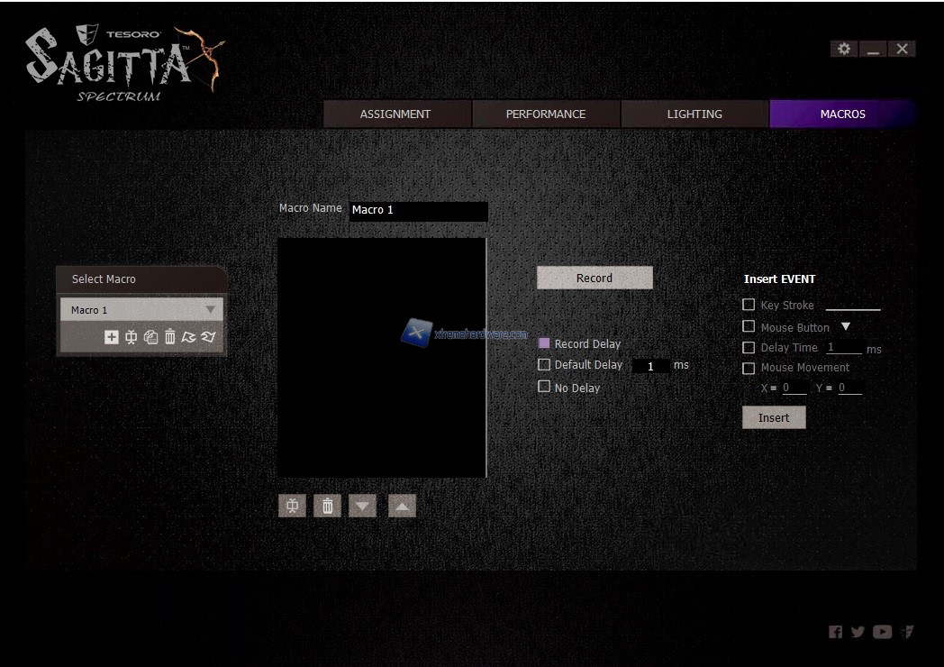 Il software presenta quattro Menù principali. Il primo da cui partiamo è ‘’Assignment’’ che come fa intuire la parola indica la possibilità di modificare gli 8 tasti totali del mouse con altre funzioni. Come sempre potremo agire su funzioni multimediali, desktop o come sempre creare e subito dopo assegnare una data macro. In questo Menù avremo la possibilità di salvare sino a 5 profili con diversi settaggi da richiamare all’occorrenza impostando un tasto dedicato. Infatti come pensavo il singolo tasto presente sul mouse nella parte superiore sarà adibito al cambio dei DPI o per meglio dire Step DPI. Non manca in questo Menù anche la possibilità di ‘’legare’’ un dato profilo ad un programma in modo tale da avere subito caricato quel profilo quando avremo lanciato il gioco o programma.
