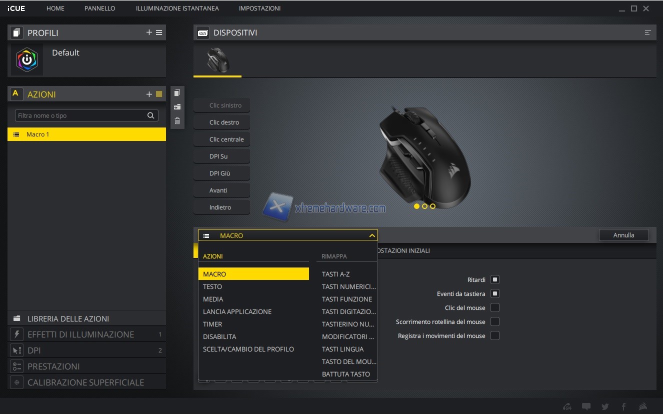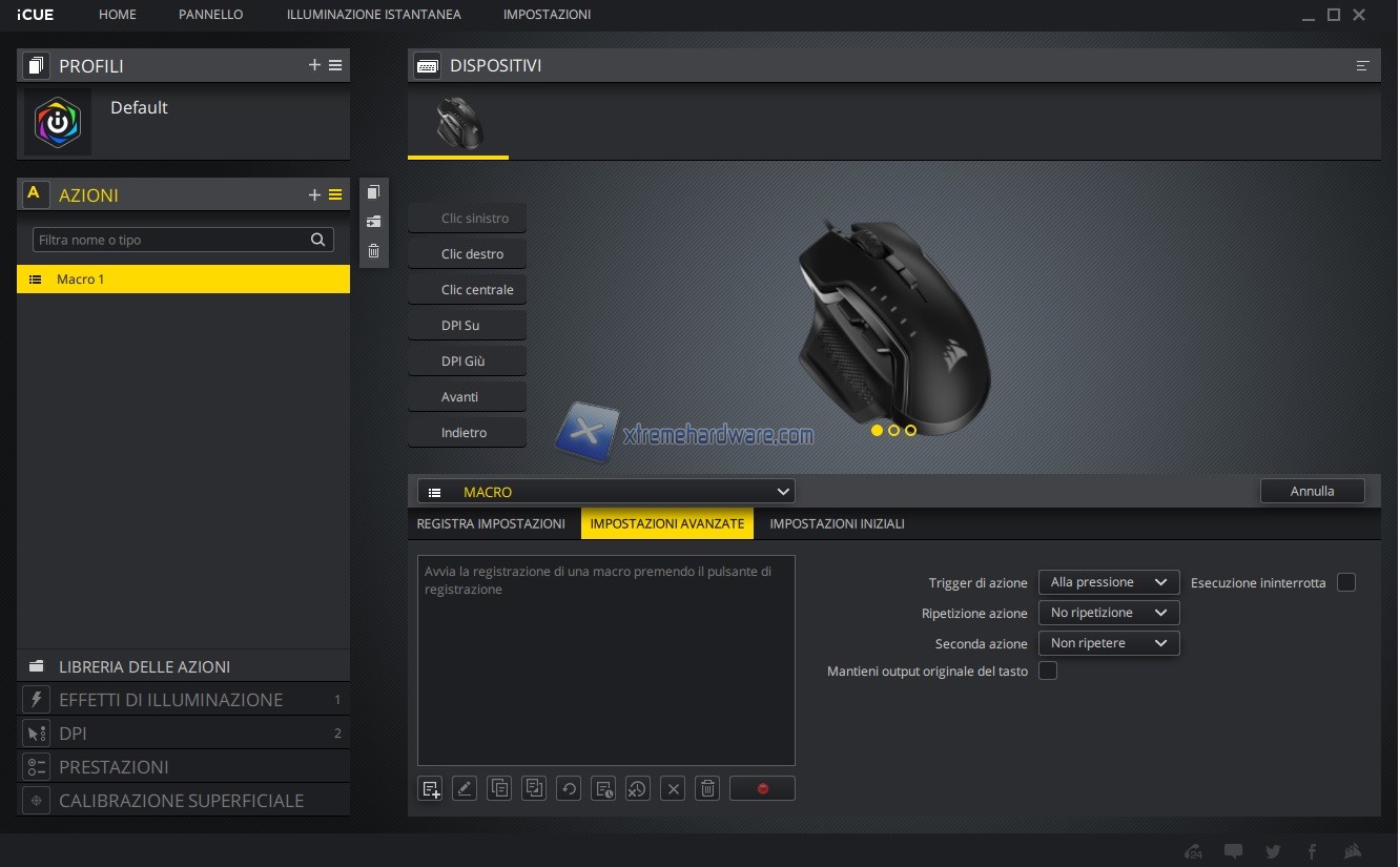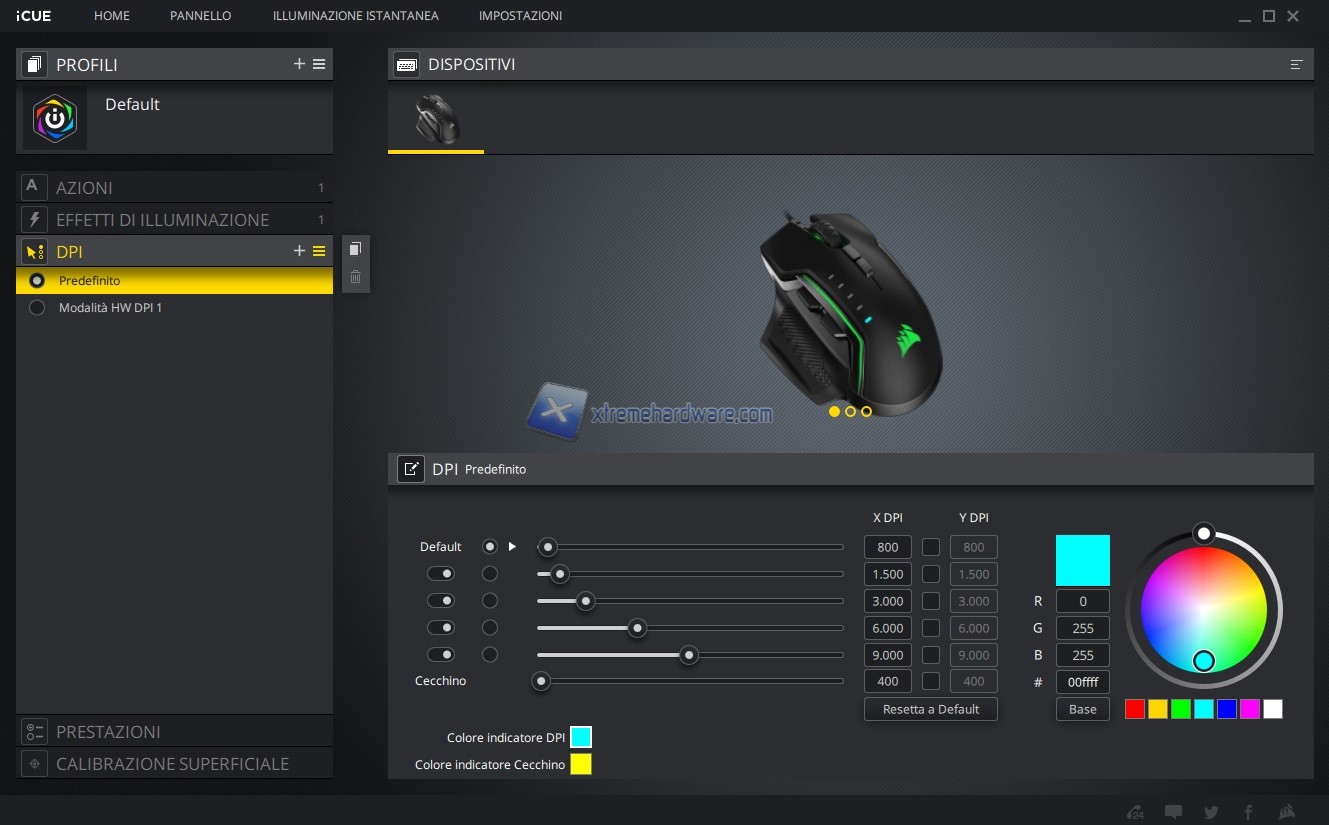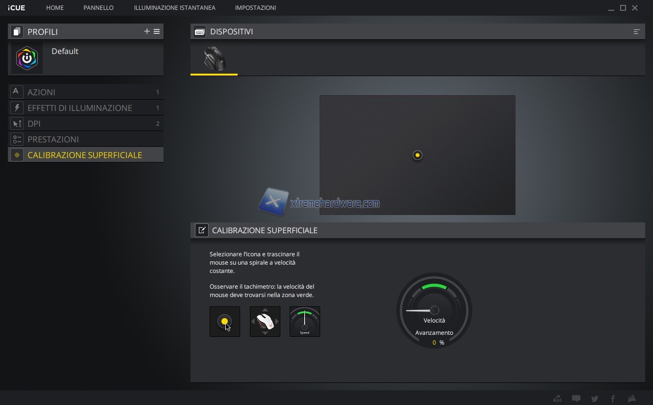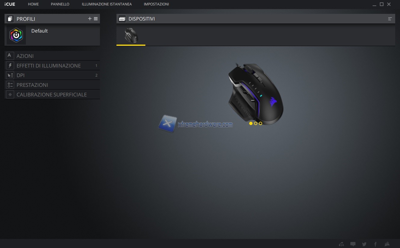 In questo capitolo invece vi riportiamo tutte le immagini relative l’ormai conosciuto e famoso software di gestione di periferiche e componenti Corsair iCUE. Software sicuramente molto completo e a mio avviso molto intuitivo. Tramite il software potremo agire sia sull’assegnazione dei tasti e relative funzioni sia sulla retroilluminazione RGB a 3 Zone sia sulle prestazioni del sensore con regolazione DPI, creazione Profili DPI ad hoc, cambio Polling Rate, attivazione dell’Angle Snapping, calibrazione della superficie di utilizzo e molto altro ancora. Le immagini parlano molto chiaramente.