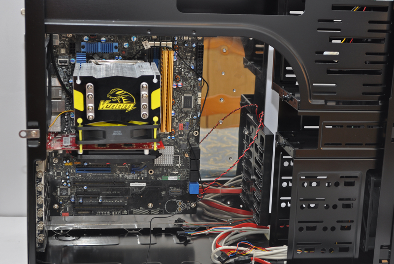 Montiamo il vassoio con i suoi relativi componenti sul case e infine andiamo a montare l’alimentatore nella parte alta. Abbiamo usato un discreto alimentatore non modulare. Come si può vedere dal risultato il tutto è confuso e l’areazione all’interno del case è compromessa da tutto quel groviglio di casi. Sicuramente la situazione può migliorare, ma con un alimentatore modulare la situazione è ben diversa. Purtroppo il case non ci aiuta molto nel nascondere i cavi dell’alimentatore.