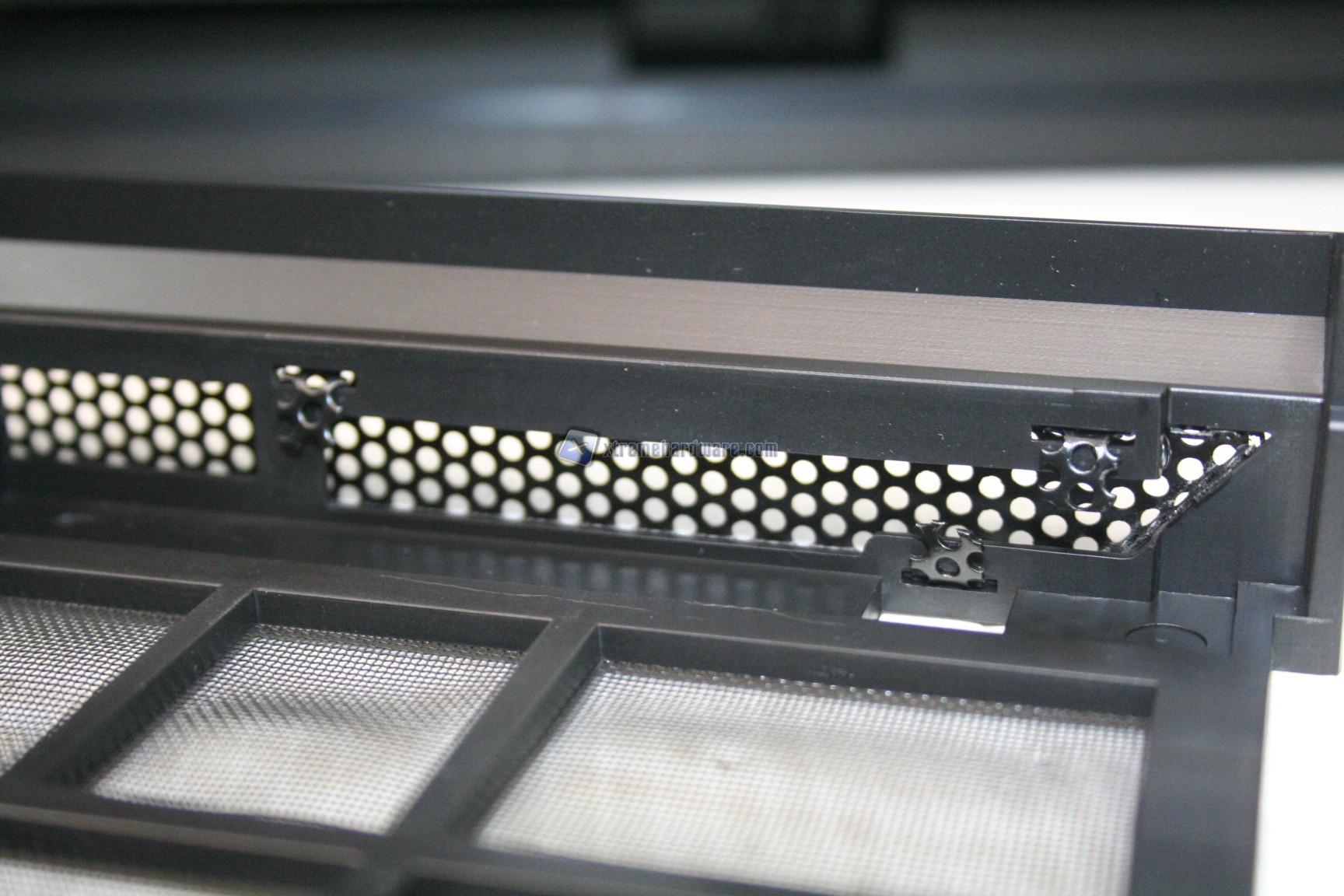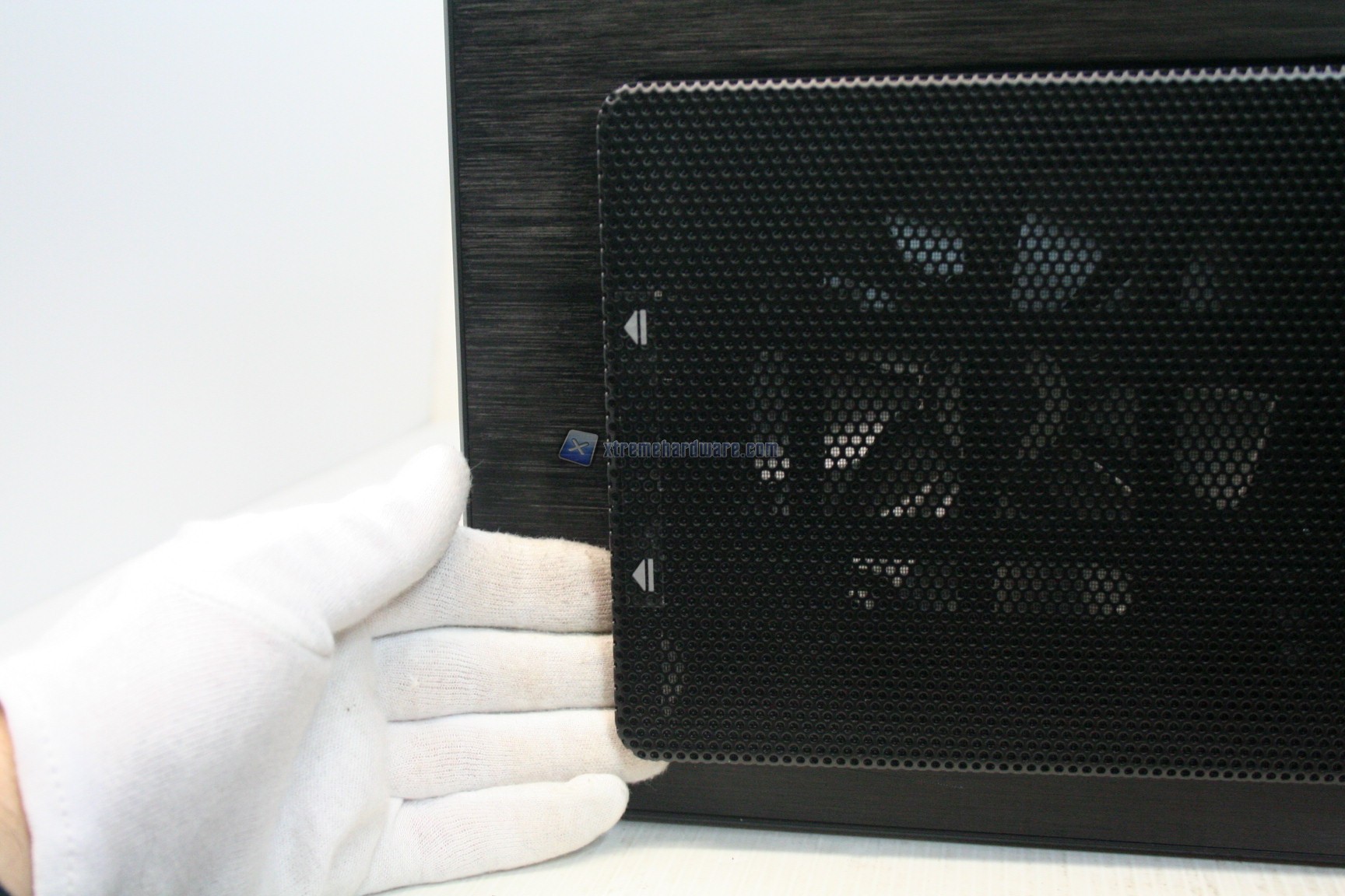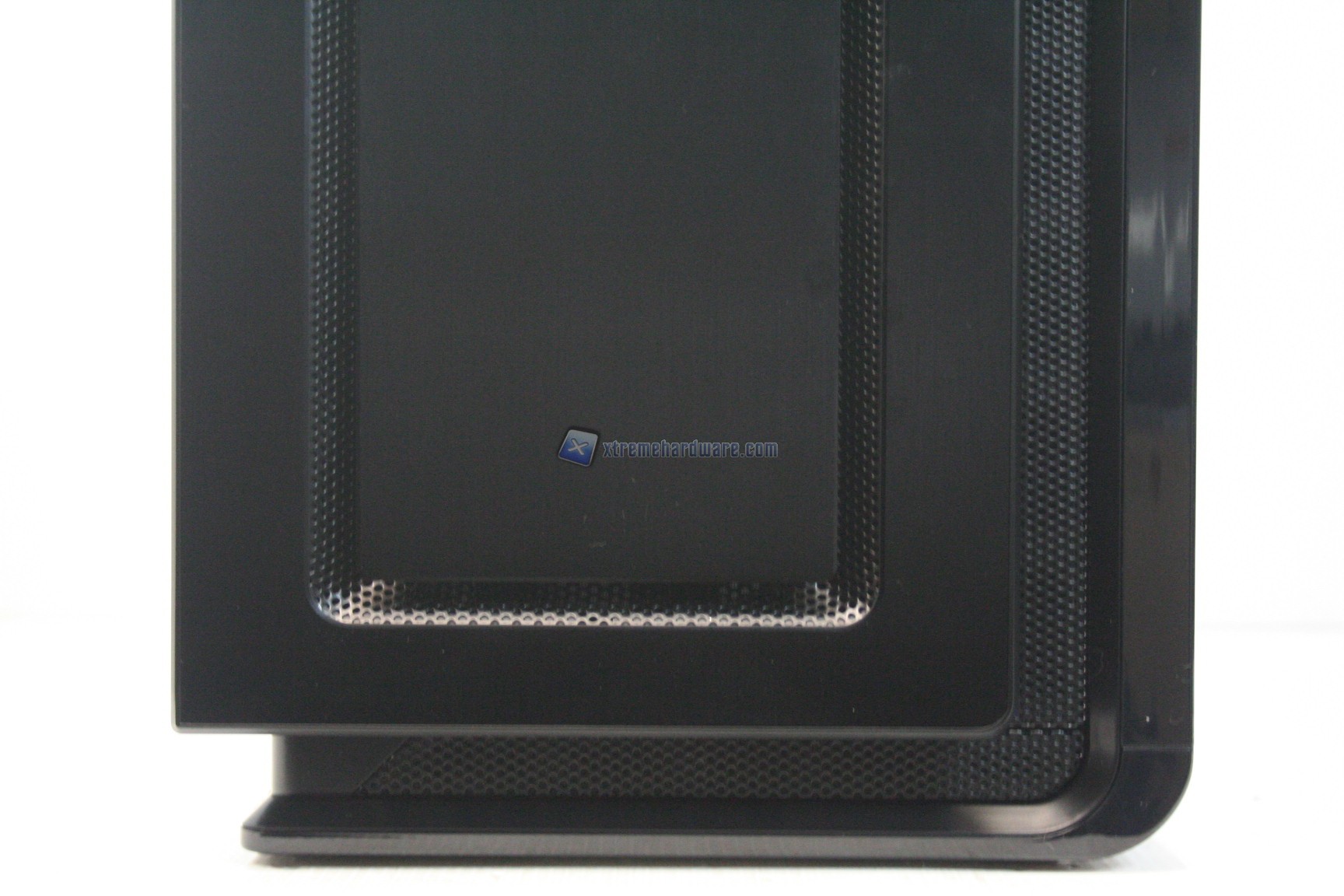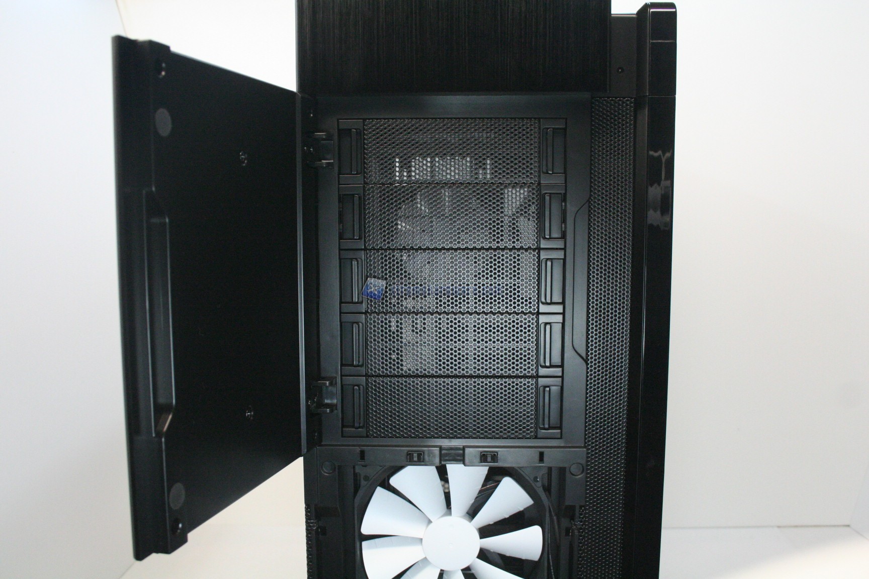 La parte frontale è caratterizzata da una struttura in alluminio spazzolato, sui generis. La parte inferiore è removibile e maschera una grande struttura contenente un filtro. Sotto quest’ultimo sono state preinstallate due ventole da 140mm. La paratia è apribile, in quanto c’è uno sportello ad apertura laterale, da destra verso sinistra. La finitura, come la realizzazione, sono eccelse.