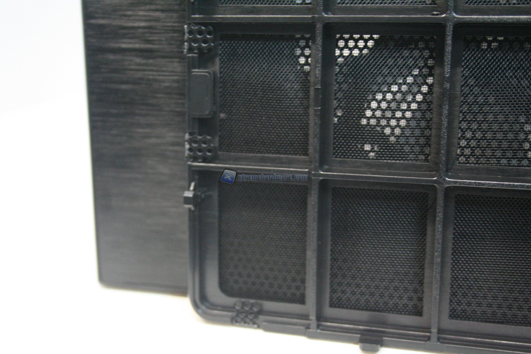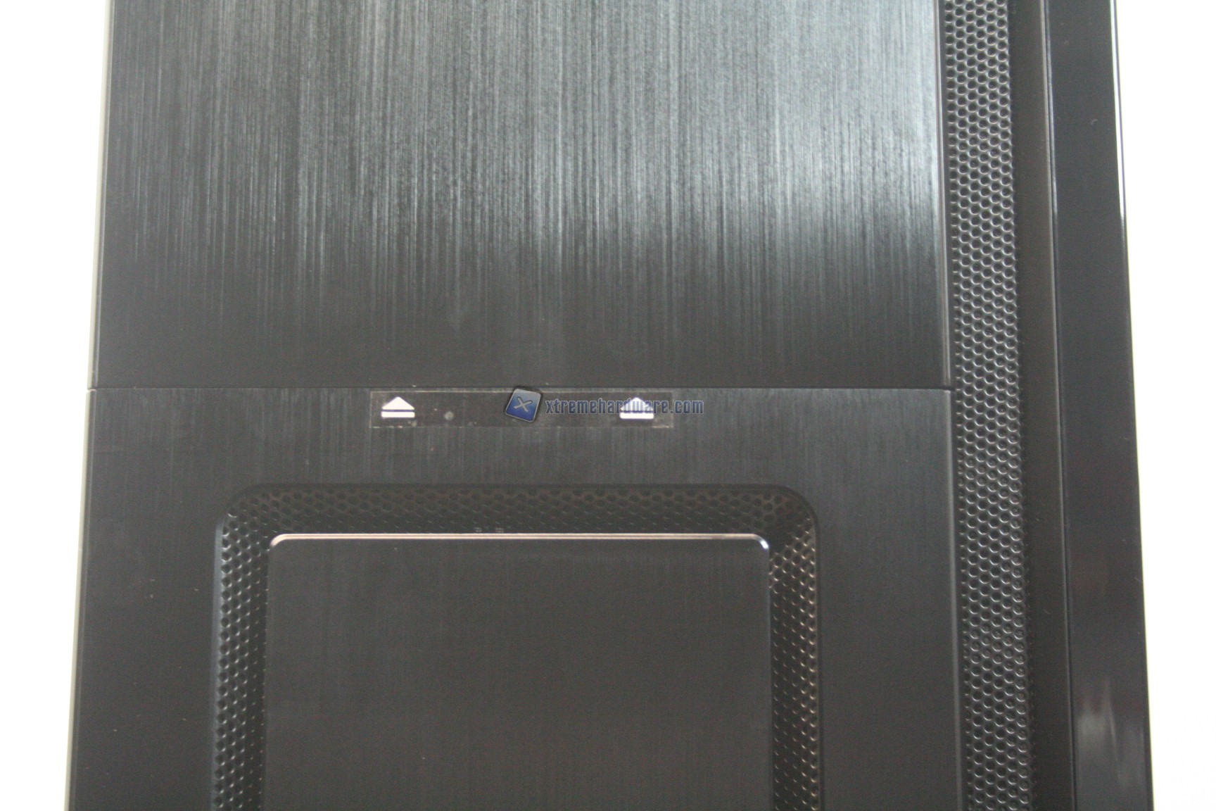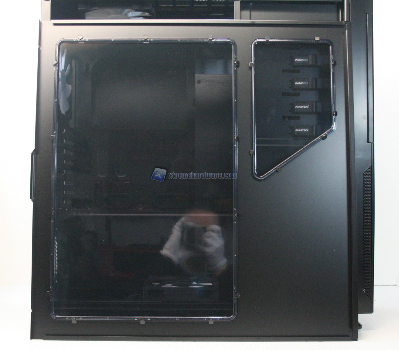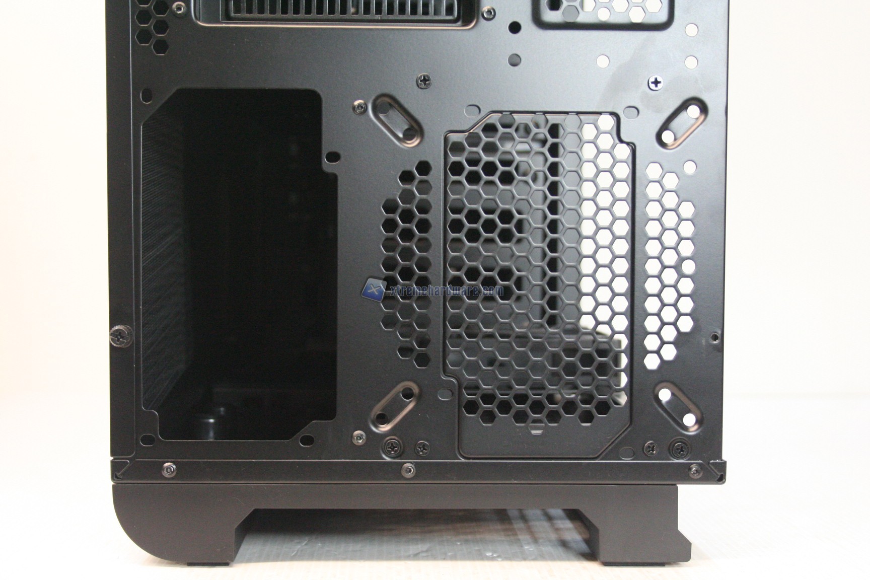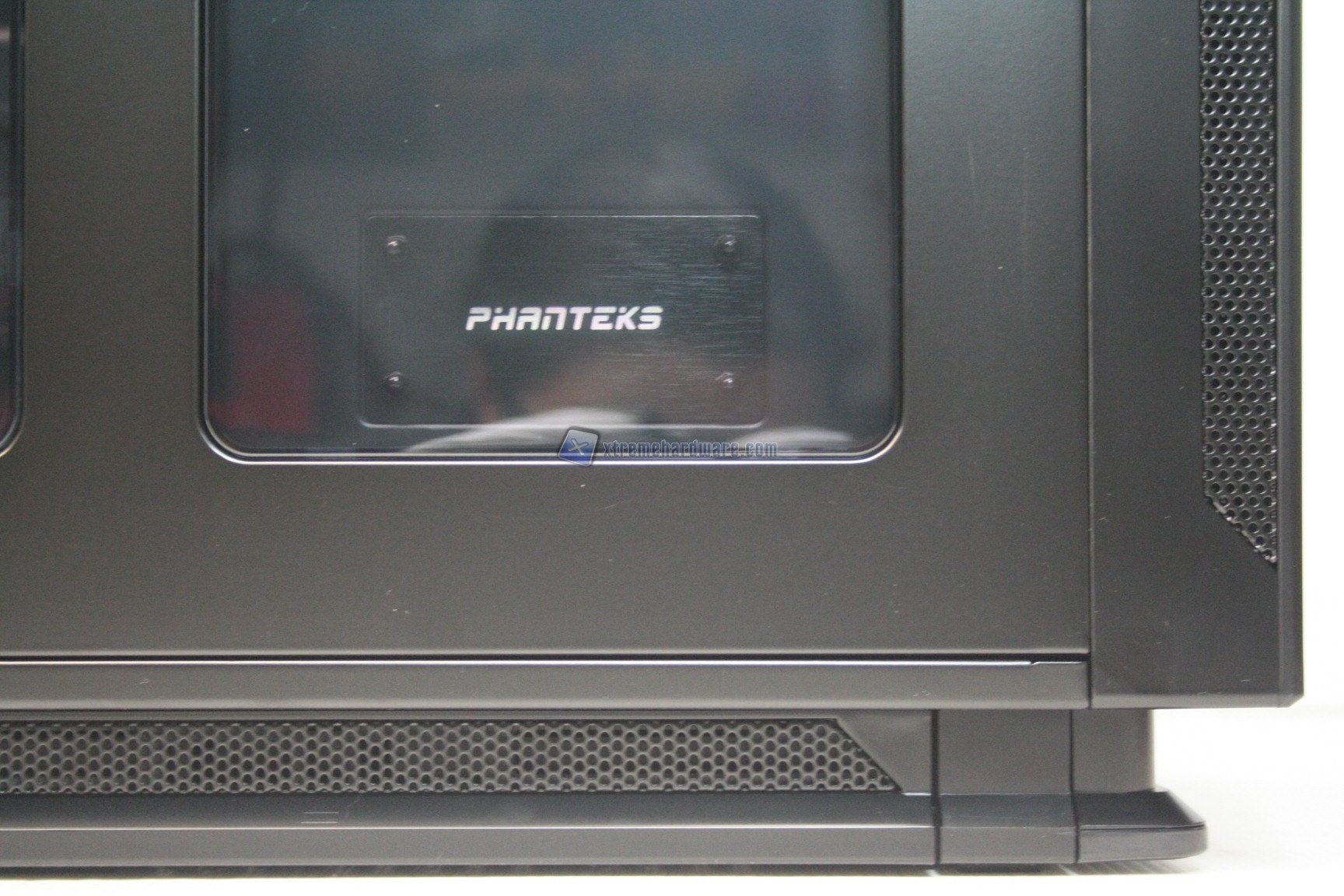 La parte frontale è caratterizzata da una struttura in alluminio spazzolato, sui generis. La parte inferiore è removibile e maschera una grande struttura contenente un filtro. Sotto quest’ultimo sono state preinstallate due ventole da 140mm. La paratia è apribile, in quanto c’è uno sportello ad apertura laterale, da destra verso sinistra. La finitura, come la realizzazione, sono eccelse.