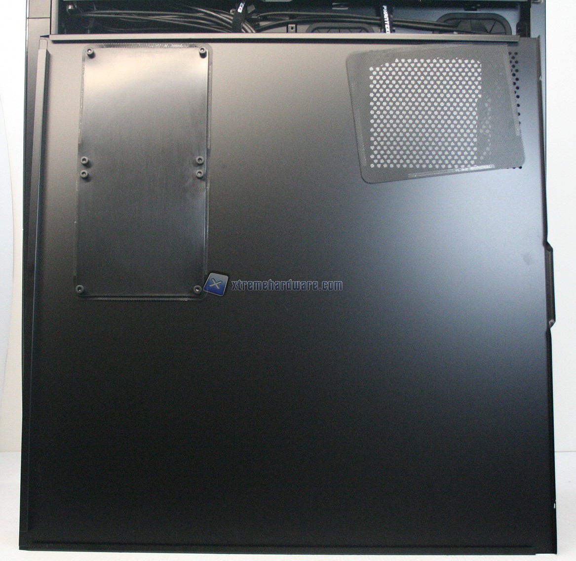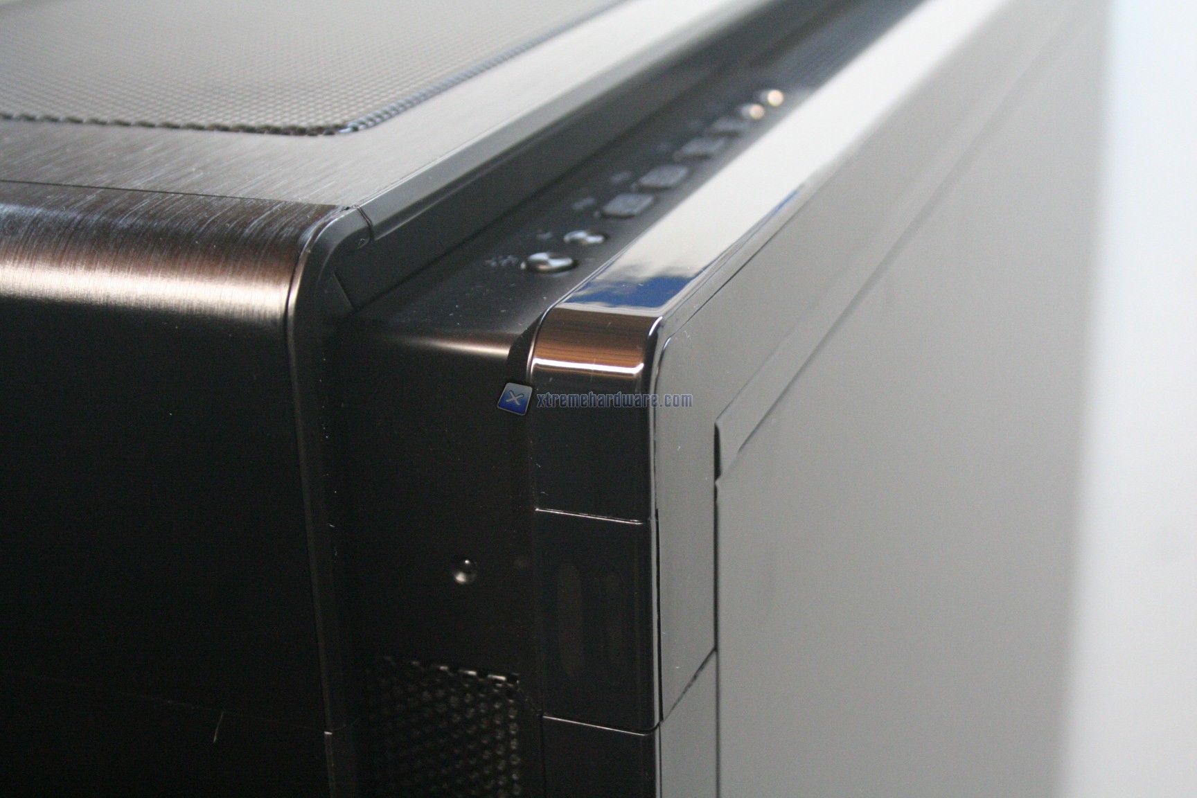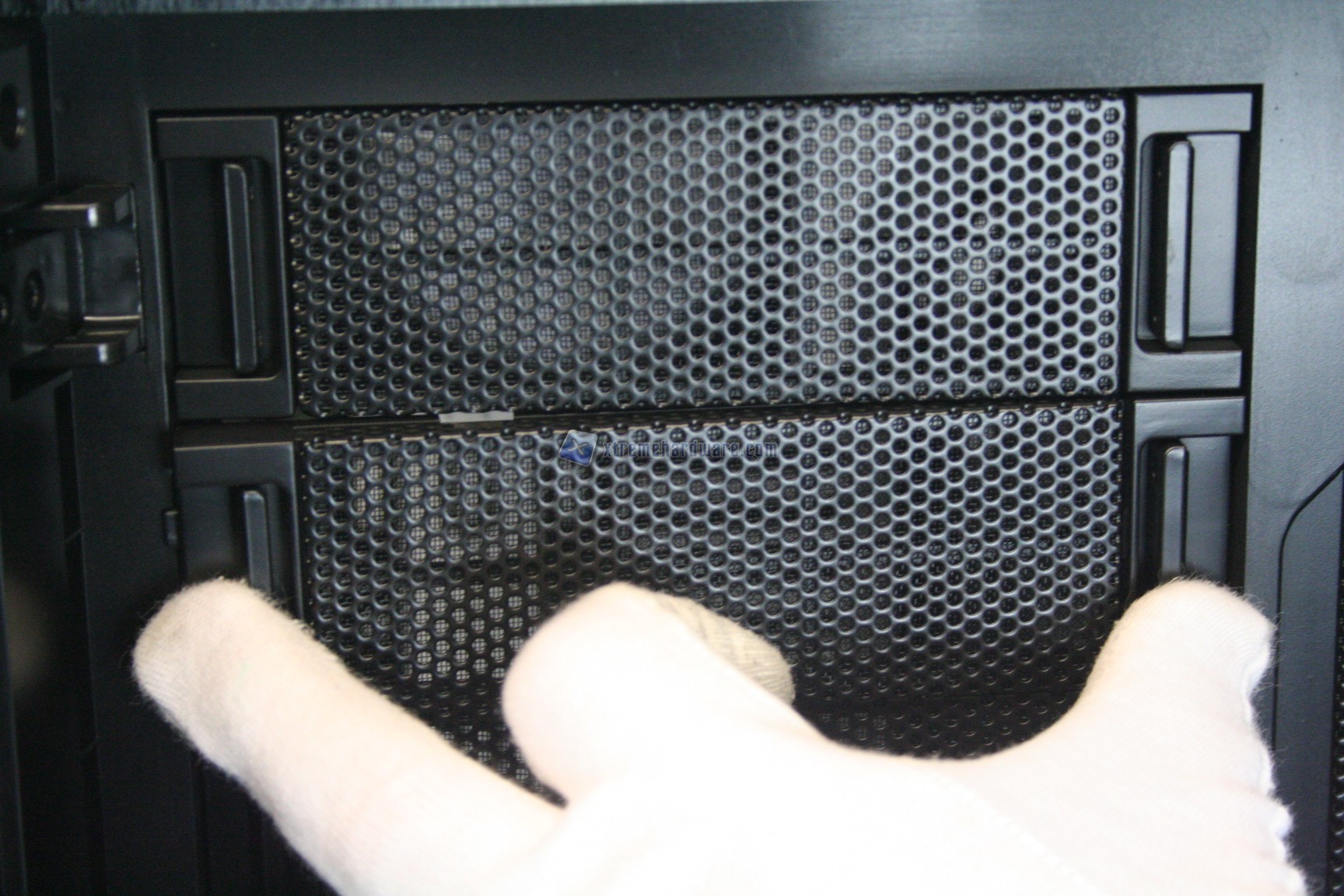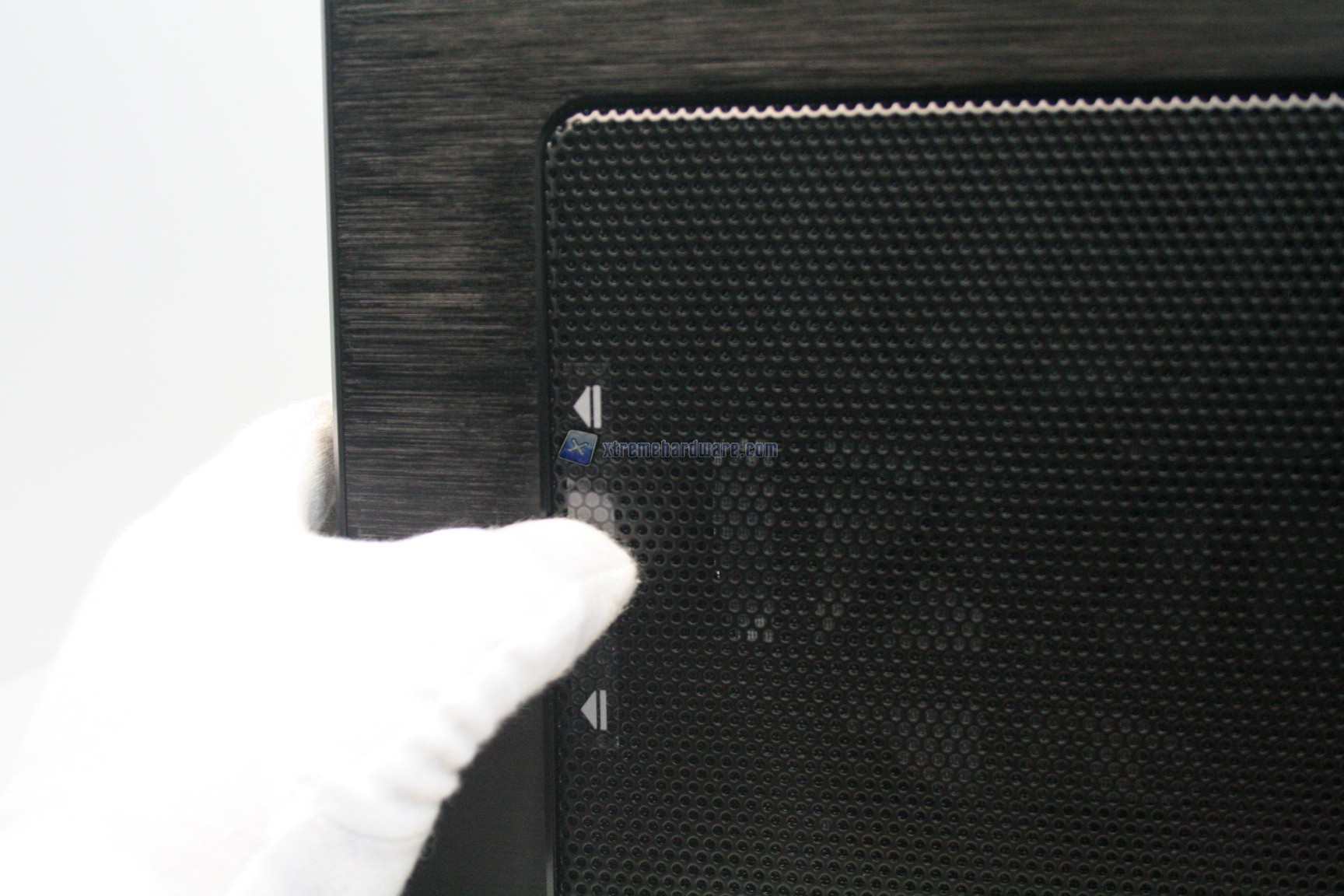 La parte frontale è caratterizzata da una struttura in alluminio spazzolato, sui generis. La parte inferiore è removibile e maschera una grande struttura contenente un filtro. Sotto quest’ultimo sono state preinstallate due ventole da 140mm. La paratia è apribile, in quanto c’è uno sportello ad apertura laterale, da destra verso sinistra. La finitura, come la realizzazione, sono eccelse.