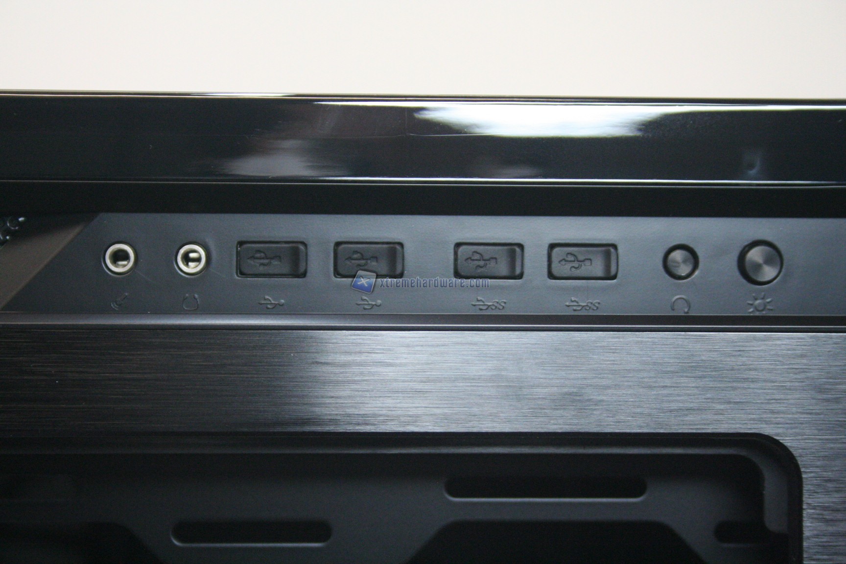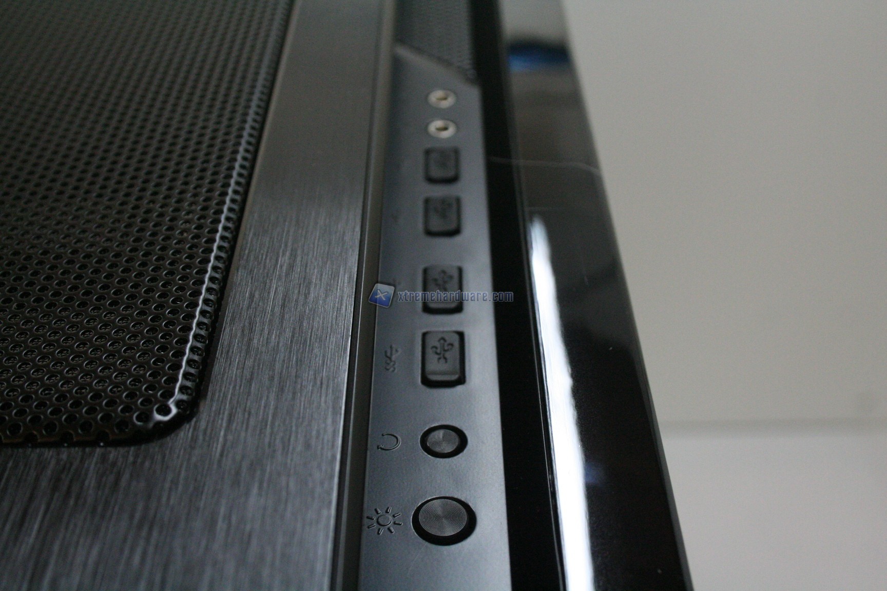 Nella parte superiore e laterale destra troviamo gli ingressi USB, I/O ed il pulsante di accensione e spegnimento dei LED laterali. Frontalmente troviamo il pulsante di accensione del sistema.