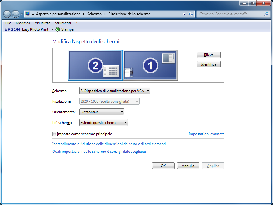 Con sistema operativo Windows 7, tramite la combinazione di tasti Win+P, si aprirà un rapido menù che ci darà la possibilità di scegliere l’unico dispositivo video (Solo computer, Solo proiettore), riprodurre su entrambi gli schermi la stessa immagine (Duplica) od affiancare la visuale al monitor predefinito (Estendi).