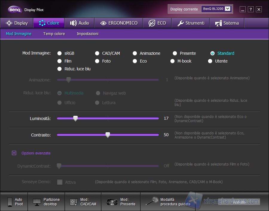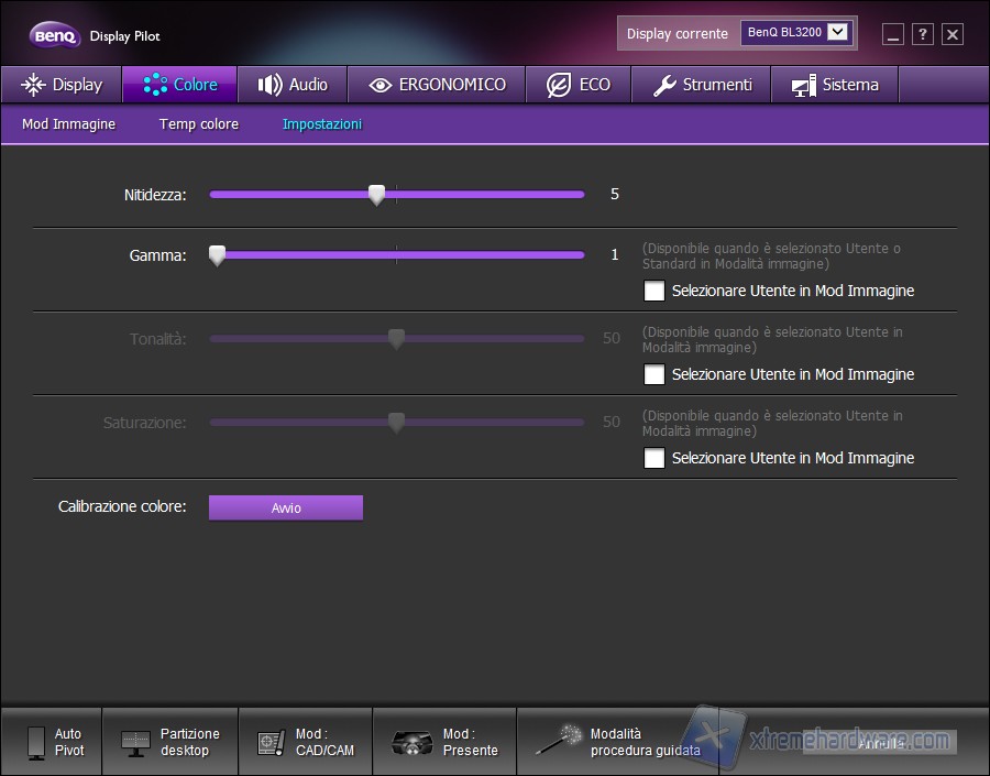 Come già accennato nel CD fornito troviamo oltre ai driver per il lettore di memorie, il manuale, le specifiche e un classico tool per la calibrazione, anche il software Display Pilot che è davvero molto comodo e di semplice utilizzo. Vengono riportate perlopiù le funzioni presenti nel menù OSD appena descritte, ma a queste, di rilevante, si aggiungono alcune voci in Strumenti, come Application Tuning che permette di adottare una determinata modalità quando si avvia un determinato software e la Partizione desktop che, se attivata, aggiunge una piccola icona nella barra degli strumenti di una qualunque finestra per poterla relegare in un riquadro che abbiamo precedentemente creato.
