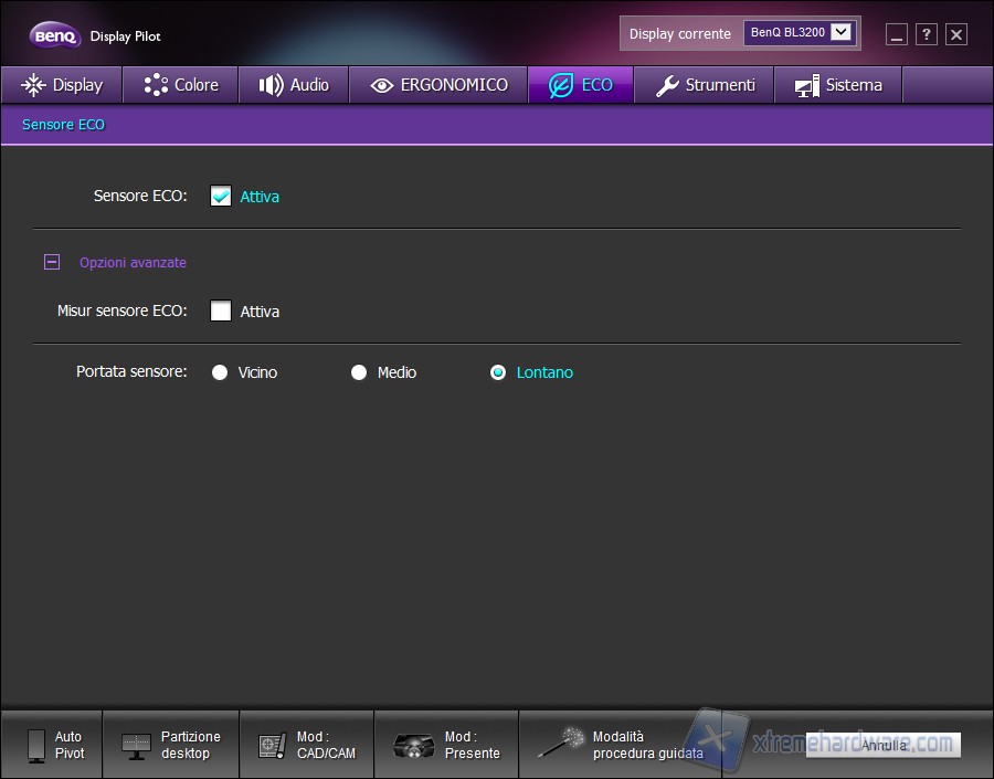 Selezionando Ergonomico si potrà attivare la regolazione automatica della luminosità e abilitare un promemoria per ricordarci di fare una pausa; i setting dell’intervallo di tempo sono di 20min, 40min, 60min, 80min e 100min. Con l’attivazione del sensore ECO, ovvero il sensore di prossimità dell’utente, il display andrà in modalità stand-by quando nessuno si troverà davanti al monitor. Il sensore, impostato con portata “Lontano” (disponibili anche Vicino e Medio), ha un raggio di circa 70 / 80 cm. Più che altro il sensore rileva l’attività con la scrittura quindi può essere attivata solo quando si sta lavorando al PC o anche durante i videogames; diversamente la funzione non è molto utile dato che non è piacevole vedersi spegnere il monitor durante la visione di un film.