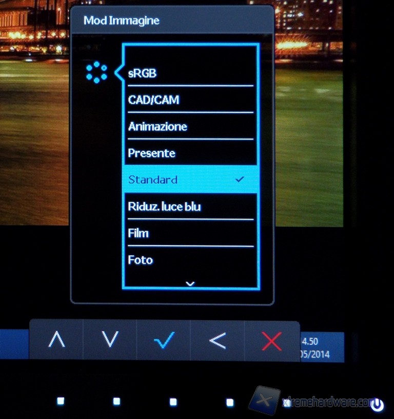 Ottimo e comodo, anzi comodissimo risulta il menù On Screen Display. Il tasto di accensione è fisico, mentre per il menù sono disponibili 5 pulsanti touch con sensore di prossimità; avvicinandoci ai controlli questi si illumineranno singolarmente con un fievole LED bianco. La stessa cosa accade al pulsante power quando il monitor è spento. Il LED di stato rimane bianco quando il monitor è acceso, mentre risulta lampeggiante e di colore arancio quando è in stand-by.